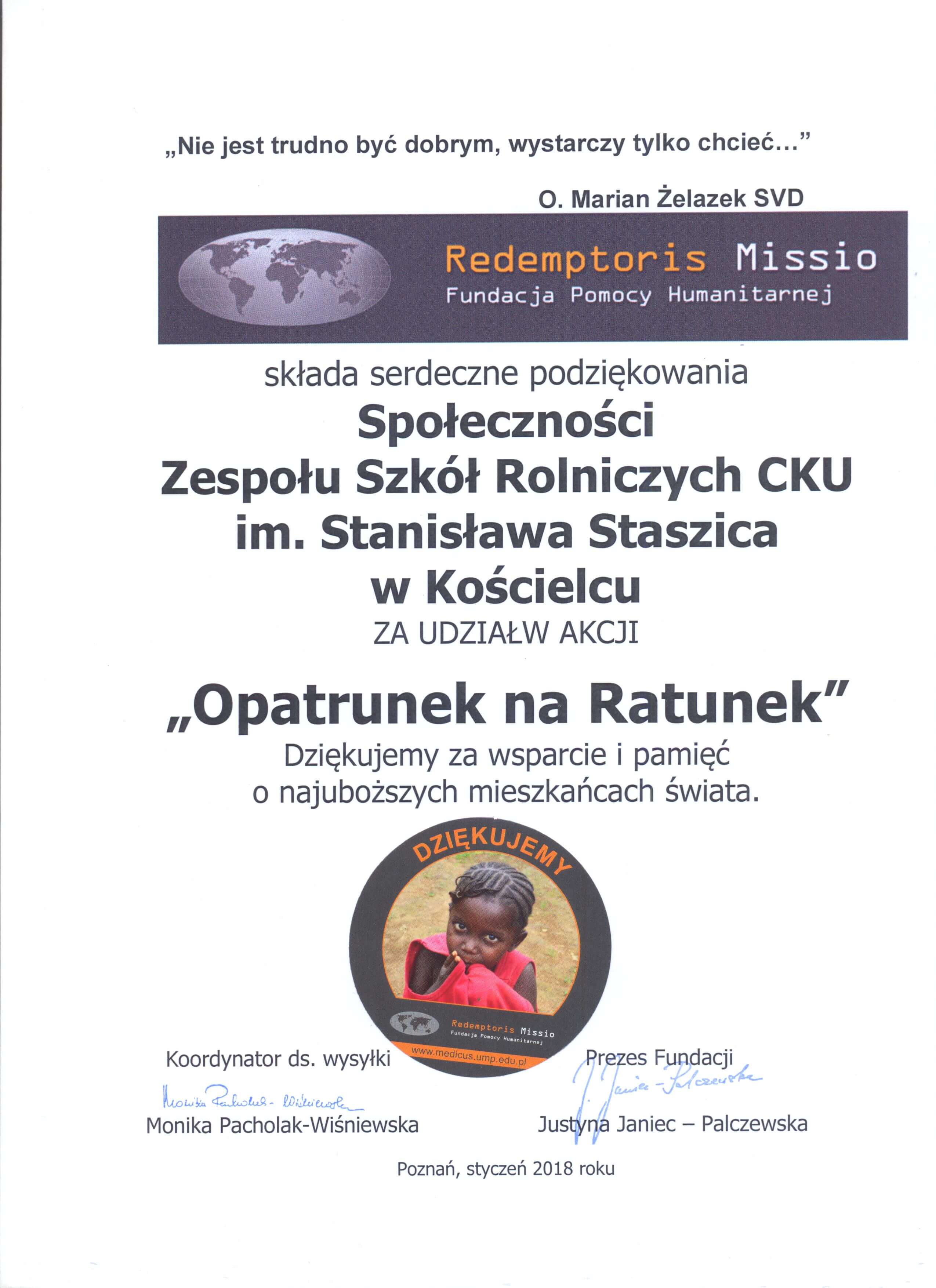 ZSRCKU w Kościelcu włączył się do ogólnopolskiej akcji „Opatrunek na ratunek”. Akcja polegała na zbiórce środków opatrunkowych dla szpitali misyjnych i przychodni w Afryce. Nauczyciele i młodzież zebrali bandaże, gazy, kompresy, plastry opatrunkowe, rękawiczki gumowe, strzykawki, igły i watę przekazując dary na adres Fundacji Pomocy Humanitarnej Redemptoris Missio w Poznaniu. Koordynatorem akcji była Aneta Gorzkowska.